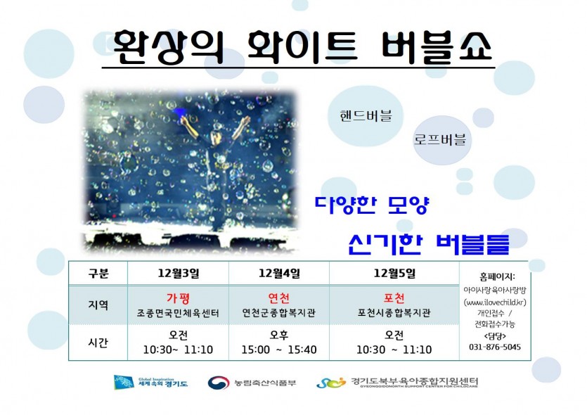 환상의화이트버블쇼 - 조부모공연 페이지 정보 작성자 관리자 댓글 0건 조회 5,728회 작성일 19-11-15 11:53 목록 본문 환상의 화이트 버블쇼 - 조부모가정의 많은신청바랍니다.담당 : 031- 876- 5045 이전글2019년 12월 이동식 도서관 일정표 19.11.27 다음글아이사랑놀이터 12월 크리스마스행사 안내 19.11.05 댓글 0 댓글목록 등록된 댓글이 없습니다.
