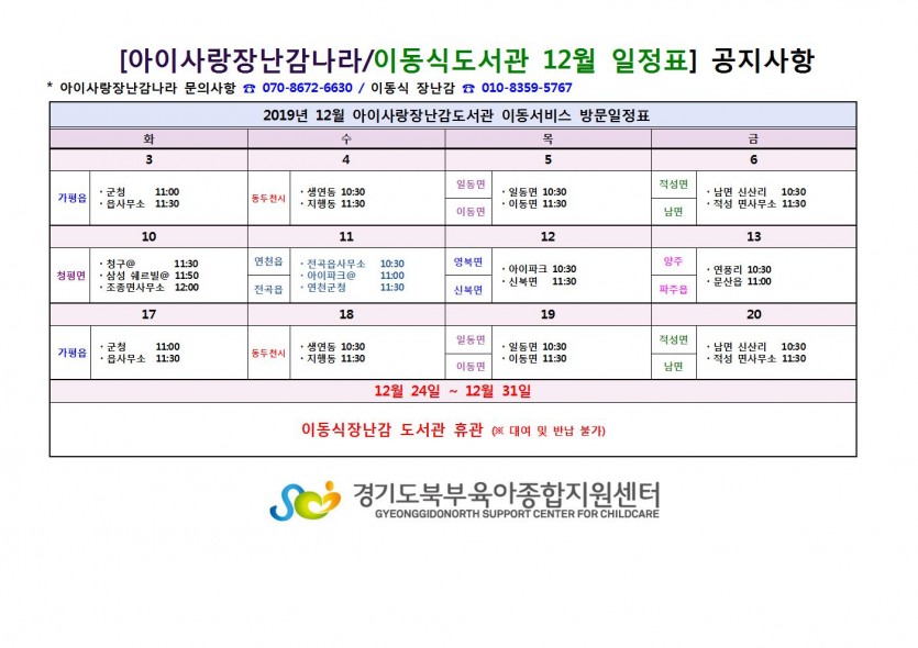 2019년 12월 이동식 도서관 일정표 페이지 정보 작성자 관리자 댓글 0건 조회 5,452회 작성일 19-11-27 16:20 목록 본문 2019년 12월 이동식 도서관 일정표 이전글2020년 1월~2월 아이사랑놀이터, 장난감나라 휴관 안내 19.12.30 다음글환상의화이트버블쇼 - 조부모공연 19.11.15 댓글 0 댓글목록 등록된 댓글이 없습니다.