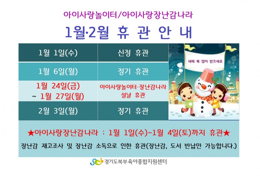 2020년 1월~2월 아이사랑놀이터, 장난감나라 휴관 안내 페이지 정보 작성자 관리자 댓글 0건 조회 5,586회 작성일 19-12-30 17:58 목록 본문 * 첨부파일 * 자세한 사항은 첨부파일을 참고 하세요. 이전글2020년 1월 이동식 도서관 일정표 20.01.09 다음글2019년 12월 이동식 도서관 일정표 19.11.27 댓글 0 댓글목록 등록된 댓글이 없습니다.
