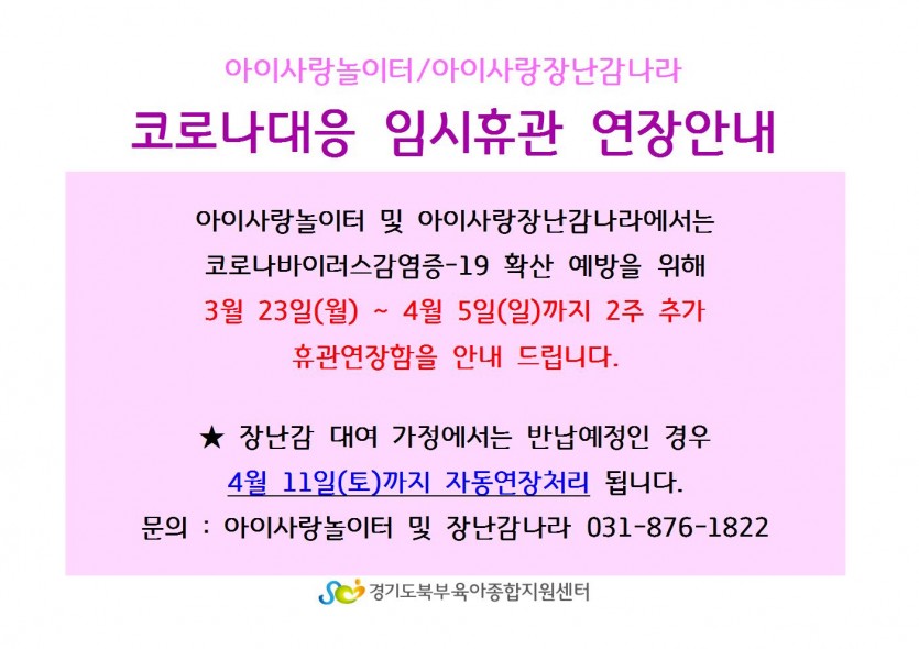 코로나 확산예방을 위한 임시휴관 추가연장 안내 페이지 정보 작성자 관리자 댓글 0건 조회 5,769회 작성일 20-03-18 09:20 목록 본문 이전글[여기여기모여라] 양육상담 홍보 안내 20.03.23 다음글코로나19 확산예방을 위한 임시휴관연장안내 20.03.06 댓글 0 댓글목록 등록된 댓글이 없습니다.