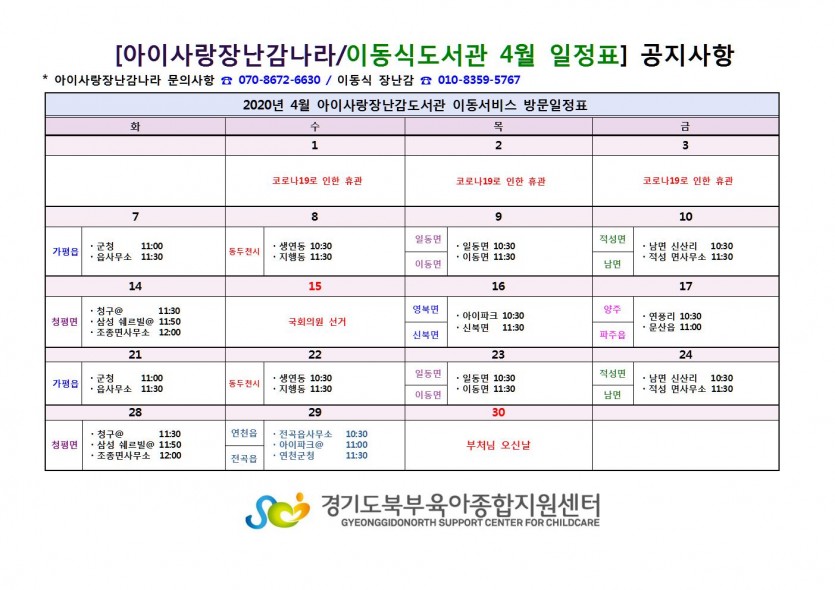 이동식 장난감 4월 방문 일정표 페이지 정보 작성자 관리자 댓글 0건 조회 5,727회 작성일 20-03-26 09:54 목록 본문 이동식 장난감 4월 방문 일정표 이전글[슬기로운 육아생활] 온라인 발달검사 신청 안내 20.03.27 다음글[여기여기모여라] 양육상담 홍보 안내 20.03.23 댓글 0 댓글목록 등록된 댓글이 없습니다.