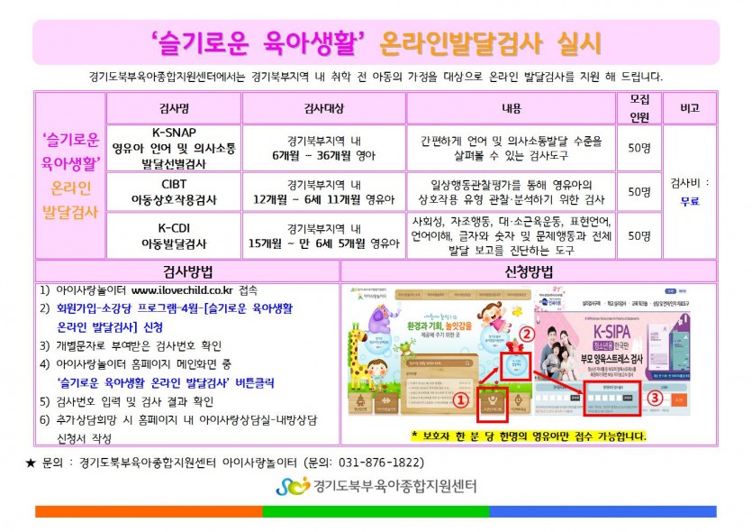 [슬기로운 육아생활] 온라인 발달검사 신청 안내 페이지 정보 작성자 관리자 댓글 0건 조회 6,173회 작성일 20-03-27 17:39 목록 본문 이전글[공지] 임시휴관 무기한 연장 안내 20.04.02 다음글이동식 장난감 4월 방문 일정표 20.03.26 댓글 0 댓글목록 등록된 댓글이 없습니다.