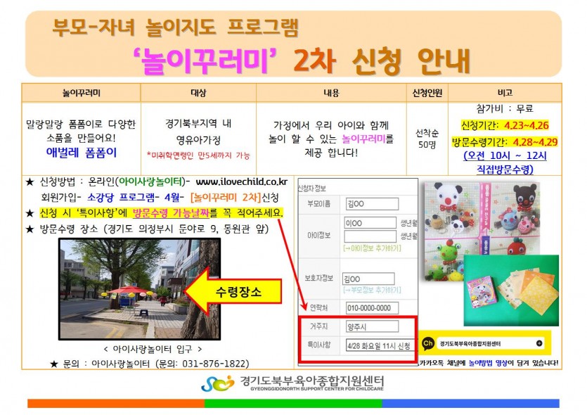 * 대상 : 경기북부지역 내 영유아가정 (미취학연령인 만5세까지 가능)
