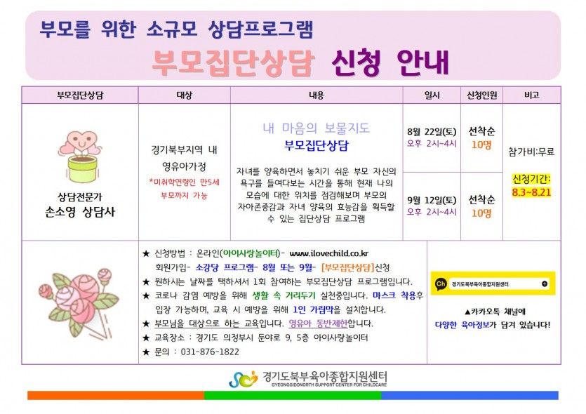 자녀를 양육하면서 놓치기 쉬운 부모 자신의 욕구를 들여다보는 시간을 통해 현재 나의 모습에 대한 위치를 점검해보며 부모의 자아 존중감과 자녀 양육의 효능감을 획득할 수 있는 집단상담 프로그램
