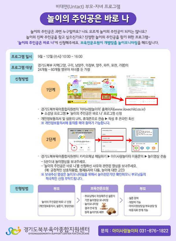 * 프로그램 대상 : 경기도 북부지역(고양, 구리, 남양주, 의정부, 양주, 파주, 포천, 가평)의 24개월~60개월 영유아 자녀를 둔 가정