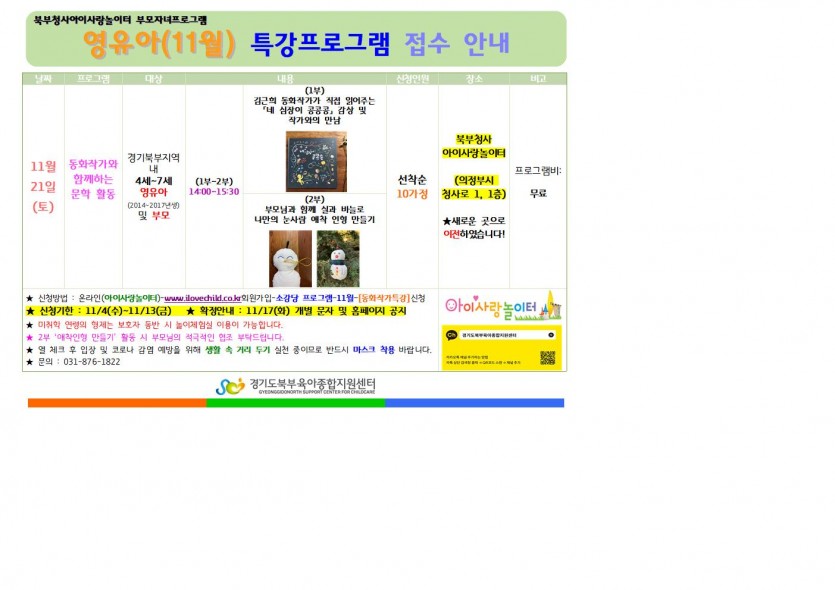 [부모자녀프로그램]영유아(11월) 특강프로그램 접수안내(문학 활동)