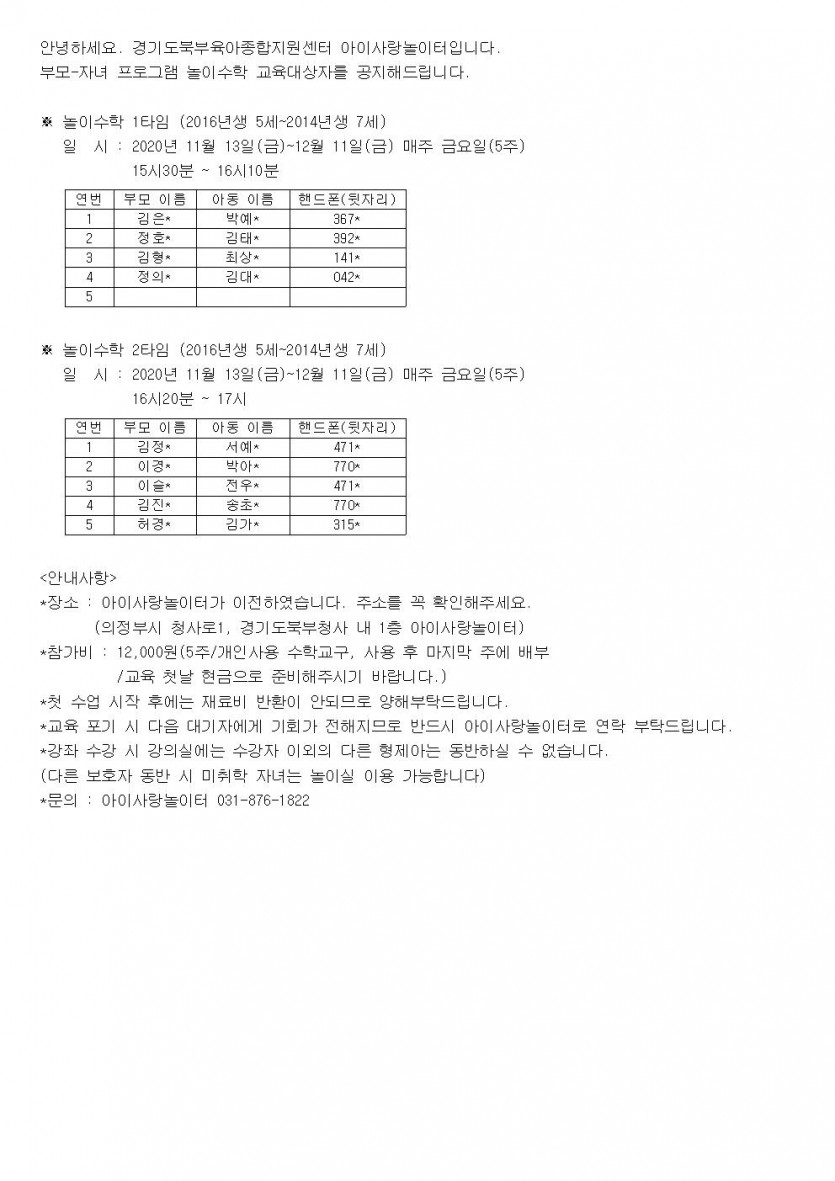 [공지] 놀이수학 교육대상자 공지 페이지 정보 작성자 관리자 댓글 0건 조회 5,562회 작성일 20-11-10 00:38 목록 본문 *자세한 사항은 첨부파일을 확인해주세요. 감사합니다.문의 : 아이사랑놀이터 031-876-1822 이전글[공지] 동화독후놀이 교육대상자 공지 20.11.10 다음글[부모자녀프로그램] 아빠와 함께하는 목공놀이 20.11.09 댓글 0 댓글목록 등록된 댓글이 없습니다.