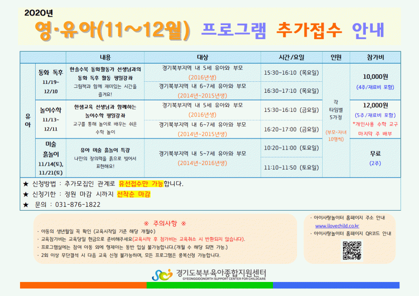 [추가접수]부모자녀프로그램안내 페이지 정보 작성자 관리자 댓글 0건 조회 5,804회 작성일 20-11-13 09:15 목록 본문 첨부파일을 참고해주시기 바랍니다. 감사합니다. 이전글동화작가와 함께하는 문학활동 교육대상자 공지 20.11.17 다음글(공지)놀이수학 교육대상자 공지 20.11.12 댓글 0 댓글목록 등록된 댓글이 없습니다.