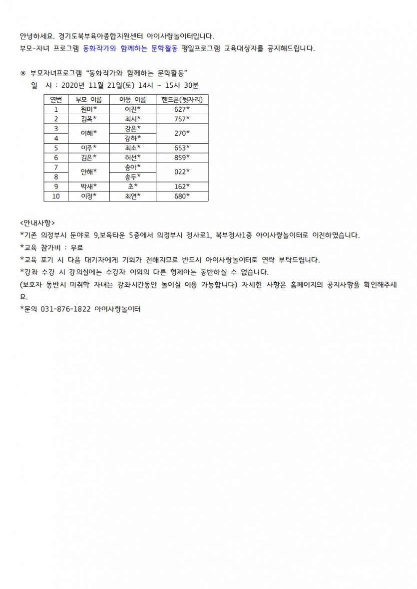 동화작가와 함께하는 문학활동 교육대상자 공지 페이지 정보 작성자 관리자 댓글 0건 조회 5,650회 작성일 20-11-17 17:45 목록 본문 이전글[공지] 아이사랑놀이터 이용안내 20.11.18 다음글[추가접수]부모자녀프로그램안내 20.11.13 댓글 0 댓글목록 등록된 댓글이 없습니다.