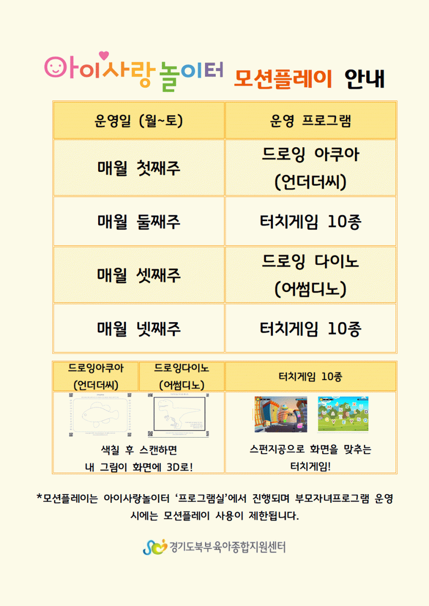 아이사랑놀이터에서는 프로그램실에서 "모션플레이"를 운영하고 있습니다.