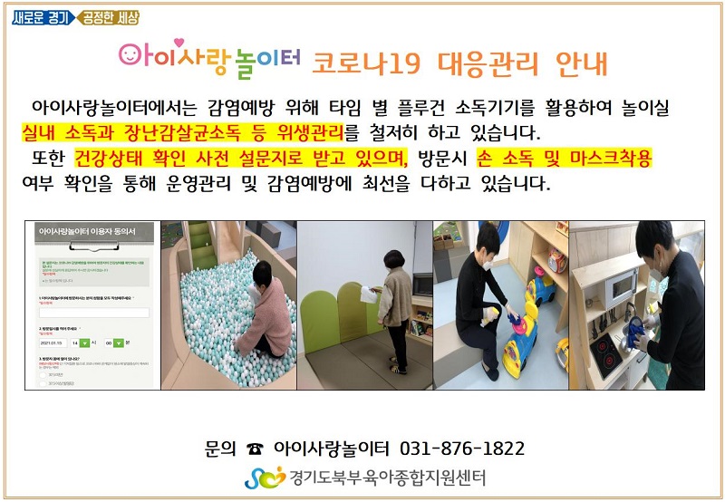 [아이사랑놀이터] 코로나19 대응관리 안내 페이지 정보 작성자 관리자 댓글 0건 조회 6,094회 작성일 21-01-15 16:11 목록 본문 문의:아이사랑놀이터 031-876-1822 이전글[아이사랑놀이터] 청사본관1층 화장실 공사 안내 21.01.20 다음글[아이사랑놀이터] 2021 신축년 새해인사 및 운영안내 21.01.11 댓글 0 댓글목록 등록된 댓글이 없습니다.