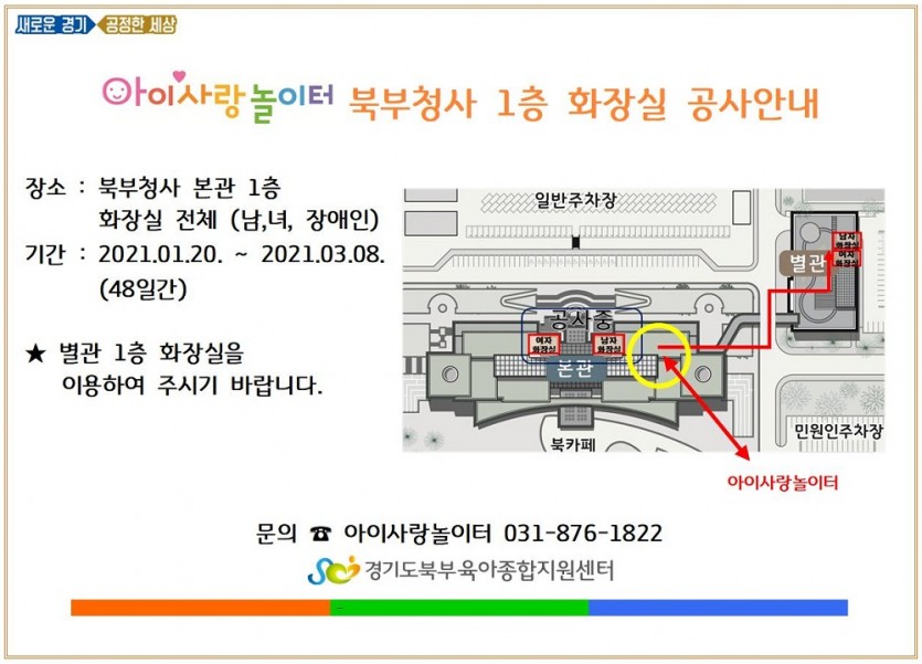 [아이사랑놀이터] 청사본관1층 화장실 공사 안내 페이지 정보 작성자 관리자 댓글 0건 조회 5,568회 작성일 21-01-20 16:38 목록 본문 문의 : 아이사랑놀이터 031-876-1822 이전글[아이사랑놀이터] 유모차 살균소독 서비스 안내 21.02.02 다음글[아이사랑놀이터] 코로나19 대응관리 안내 21.01.15 댓글 0 댓글목록 등록된 댓글이 없습니다.
