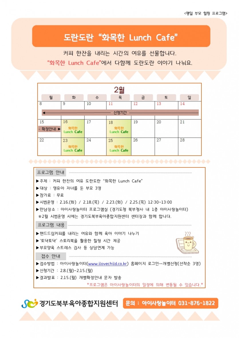 [아이사랑놀이터] "도란도란" 화목한 Lunch Cafe 페이지 정보 작성자 관리자 댓글 0건 조회 5,623회 작성일 21-02-04 16:40 목록 본문 이전글[아이사랑놀이터] 21.02.04 다음글[아이사랑놀이터] "조물조물" 떡 만들기 키트배부마감안내 21.02.03 댓글 0 댓글목록 등록된 댓글이 없습니다.