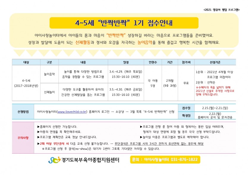 [아이사랑놀이터] 4~5세 반짝반짝 1기 접수안내 페이지 정보 작성자 관리자 댓글 0건 조회 5,897회 작성일 21-02-05 14:38 목록 본문 문의 : 아이사랑놀이터 031-876-1822 이전글[아이사랑놀이터] 6~7세 무럭무럭 1기 접수안내 21.02.05 다음글[아이사랑놀이터] 21.02.04 댓글 0 댓글목록 등록된 댓글이 없습니다.