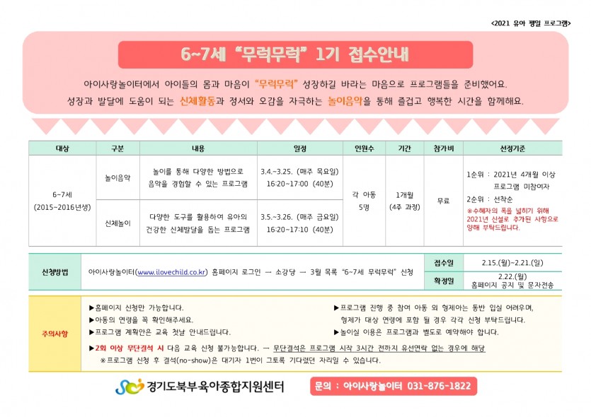 [아이사랑놀이터] 6~7세 무럭무럭 1기 접수안내 페이지 정보 작성자 관리자 댓글 0건 조회 5,986회 작성일 21-02-05 14:40 목록 본문 문의 : 아이사랑놀이터 031-876-1822 이전글[아이사랑놀이터] 아이사랑상담실 상담안내 21.02.10 다음글[아이사랑놀이터] 4~5세 반짝반짝 1기 접수안내 21.02.05 댓글 0 댓글목록 등록된 댓글이 없습니다.