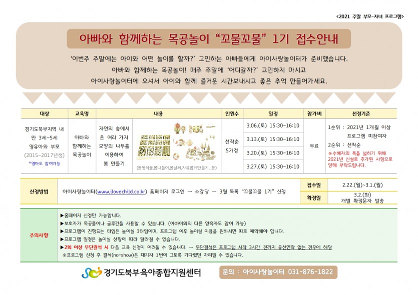 [아이사랑놀이터] 아빠와 함께하는 목공놀이 "꼬물꼬물" 1기 접수안내 페이지 정보 작성자 관리자 댓글 0건 조회 5,690회 작성일 21-02-22 14:39 목록 본문 문의 : 아이사랑놀이터 031-876-1822 이전글[아이사랑놀이터] 아빠와 함께하는 목공놀이 21.02.22 다음글[아이사랑놀이터] 놀이실 예약 및 이용안내 21.02.19 댓글 0 댓글목록 등록된 댓글이 없습니다.