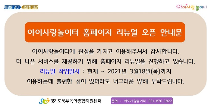[아이사랑놀이터] 홈페이지 리뉴얼 오픈 안내문 페이지 정보 작성자 관리자 댓글 0건 조회 5,683회 작성일 21-02-23 17:51 목록 본문 문의 : 아이사랑놀이터 031-876-1822 이전글[아이사랑놀이터]놀이보따리 배부안내 21.03.05 다음글[아이사랑놀이터] 아빠와 함께하는 목공놀이 21.02.22 댓글 0 댓글목록 등록된 댓글이 없습니다.