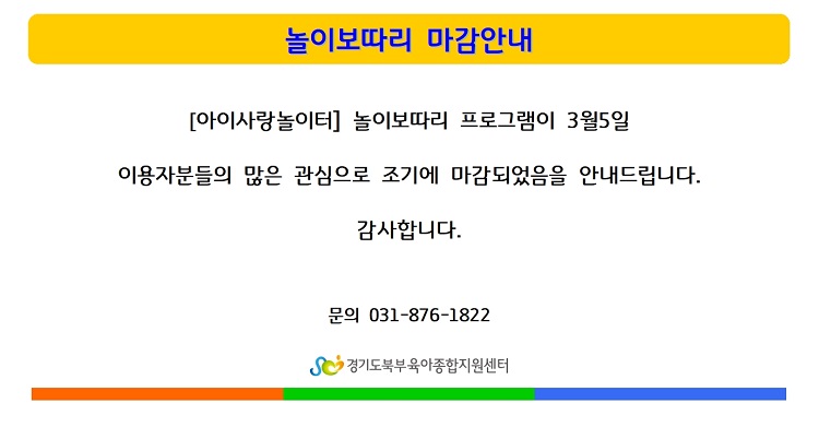 [아이사랑놀이터]놀이보따리 마감안내 페이지 정보 작성자 관리자 댓글 0건 조회 6,502회 작성일 21-03-06 16:51 목록 본문 이전글[아이사랑놀이터] 6~7세 무럭무럭 2기 접수안내 21.03.11 다음글[아이사랑놀이터]놀이보따리 배부안내 21.03.05 댓글 0 댓글목록 등록된 댓글이 없습니다.