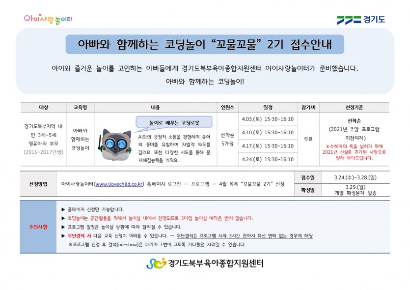 - 이전글[아이사랑놀이터] 아빠와 함께하는 "꼬물꼬물 코딩놀이" 2기 21.03.25