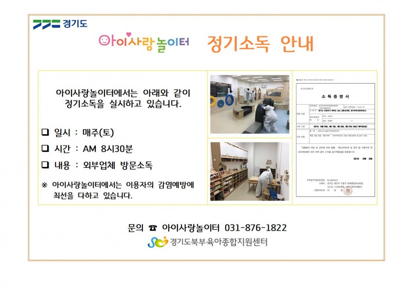 [아이사랑놀이터] 소독관리 안내 페이지 정보 작성자 관리자 댓글 0건 조회 5,670회 작성일 21-04-29 17:18 목록 본문 이전글[아이사랑놀이터] 5월 가정의 달 휴관 안내 21.04.29 다음글[아이사랑놀이터] 커피 "도란도란 3,4기" 모집안내 21.04.26 댓글 0 댓글목록 등록된 댓글이 없습니다.