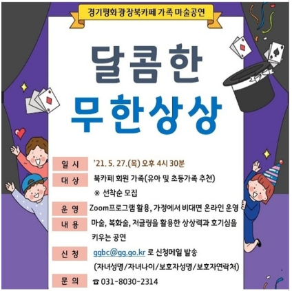 [아이사랑놀이터] 경기평화광장북카페 가족 마술공연 안내 페이지 정보 작성자 관리자 댓글 0건 조회 5,341회 작성일 21-05-14 13:31 목록 본문 이전글[아이사랑놀이터] 분실물 보관 및 처리 안내 21.05.14 다음글[아이사랑놀이터] 놀이실 예약 및 이용안내 21.05.14 댓글 0 댓글목록 등록된 댓글이 없습니다.