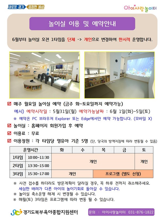 [아이사랑놀이터] 놀이실 이용 및 예약 안내 페이지 정보 작성자 관리자 댓글 0건 조회 6,518회 작성일 21-05-25 14:31 목록 본문 이전글[아이사랑놀이터] 비대면 놀이키트 배부 21.05.25 다음글[아이사랑놀이터] "반짝반짝 놀이음악 3기"(6~7세) 추가접수 21.05.25 댓글 0 댓글목록 등록된 댓글이 없습니다.