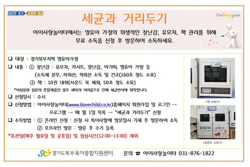 [아이사랑놀이터] 세균과 거리두기 신청안내 (유모차 및 책 무료소독) 페이지 정보 작성자 관리자 댓글 0건 조회 5,356회 작성일 21-05-27 16:54 목록 본문 이전글[아이사랑놀이터] 홈페이지 이용관련 안내 21.05.28 다음글[아이사랑놀이터] 가족과함께하는 "산들산들~ 숲에서 놀자" 마감안내 21.05.27 댓글 0 댓글목록 등록된 댓글이 없습니다.