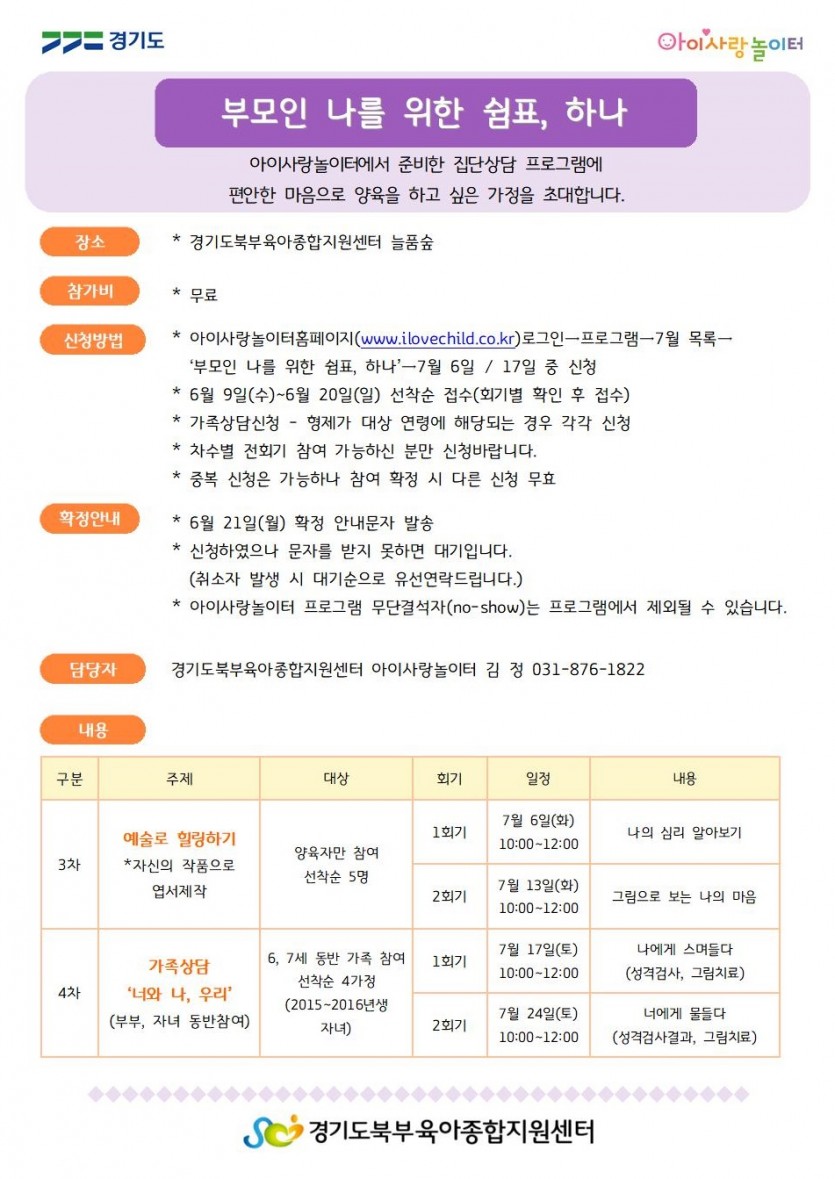 [아이사랑놀이터] 집단상담 "부모인 나를 위한 쉼표 하나" 3차, 4차 접수안내