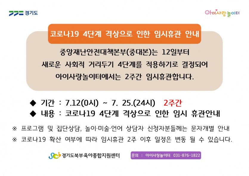 [아이사랑놀이터] 코로나19 4단계 격상으로 인한 2주간 임시휴관 안내 페이지 정보 작성자 관리자 댓글 0건 조회 5,576회 작성일 21-07-09 16:57 목록 본문 이전글[아이사랑놀이터] 가정에서 놀아요~7월 ‘비대면 놀이키트 배부’ 마감안내 21.07.13 다음글[아이사랑놀이터] 아이사랑상담실 상담안내 21.07.02 댓글 0 댓글목록 등록된 댓글이 없습니다.