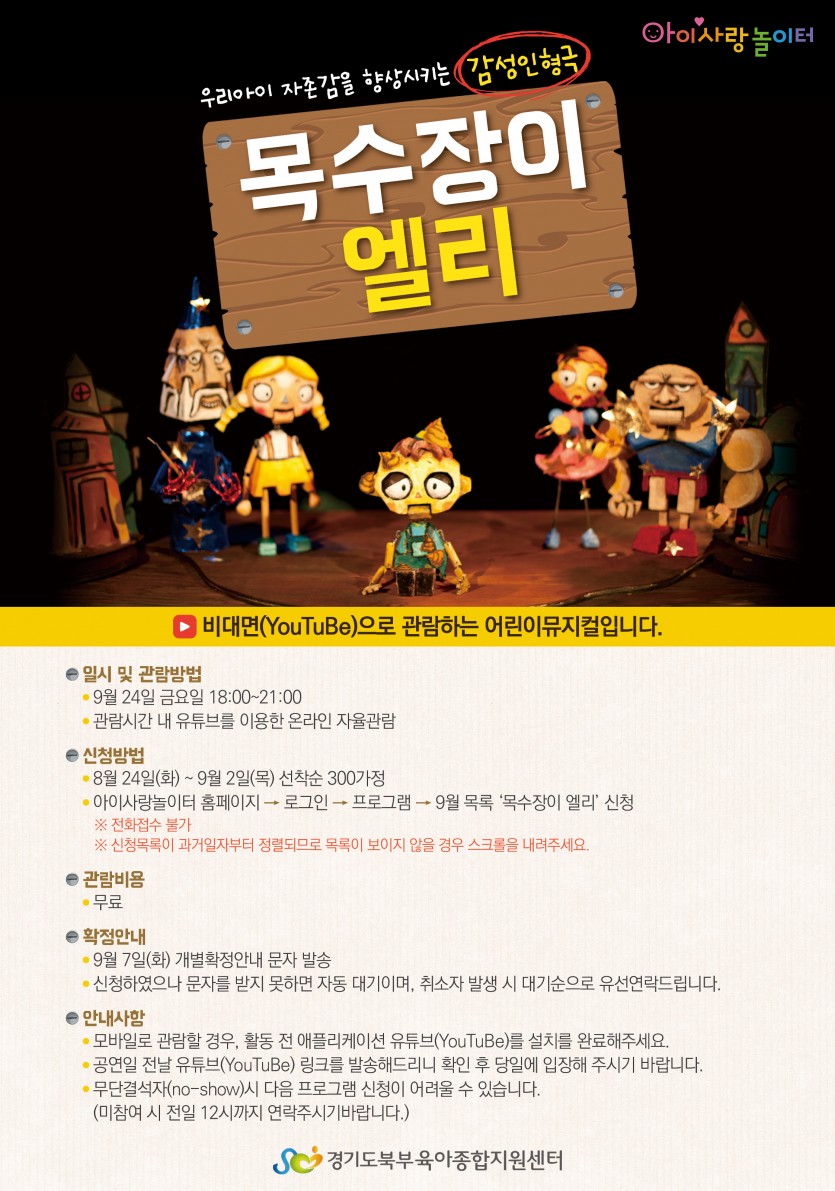 [아이사랑놀이터] 뮤지컬 "목수장이 엘리" 페이지 정보 작성자 관리자 댓글 0건 조회 5,912회 작성일 21-08-20 17:00 목록 본문 자세한 사항은 첨부된 파일을 참고해주세요문의: 아이사랑놀이터 031-876-1822 이전글[아이사랑놀이터] 목수장이엘리 마감안내 21.08.27 다음글[아이사랑놀이터] 온라인 발달검사 1차(영유아 및 부모 검사지) 21.08.18 댓글 0 댓글목록 등록된 댓글이 없습니다.