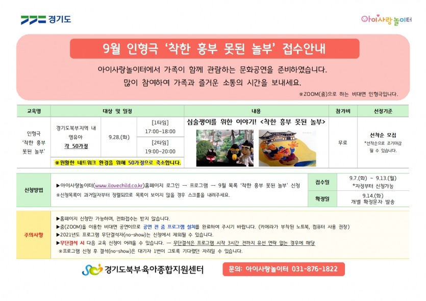 [아이사랑놀이터] 9월 인형극 신청안내 페이지 정보 작성자 관리자 댓글 0건 조회 5,742회 작성일 21-08-30 19:05 목록 본문 자세한 사항은 첨부된 파일을 참고해주세요.문의: 아이사랑놀이터 031-876-1822 이전글[아이사랑놀이터] 슬기로운 멀티미디어 놀이 신청안내 21.08.30 다음글[아이사랑놀이터] 목수장이엘리 마감안내 21.08.27 댓글 0 댓글목록 등록된 댓글이 없습니다.