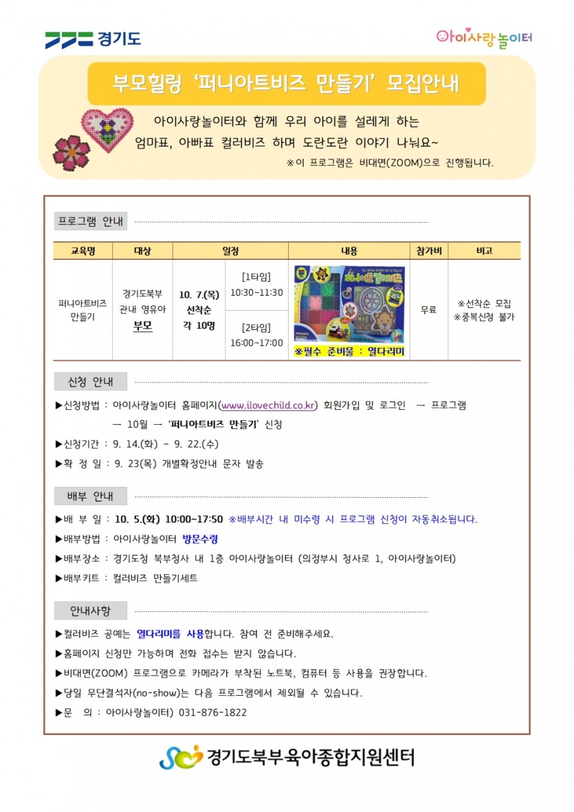 [아이사랑놀이터]부모힐링 "퍼니아트비즈 만들기" 페이지 정보 작성자 관리자 댓글 0건 조회 6,432회 작성일 21-09-07 16:48 목록 본문 자세한 사항은 첨부된 파일을 참고해주세요.문의: 아이사랑놀이터 031-876-1822 이전글[경기도북부육아종합지원센터] 소식받기 21.09.07 다음글[아이사랑놀이터]"환경을 생각하는 정리법" 21.09.07 댓글 0 댓글목록 등록된 댓글이 없습니다.