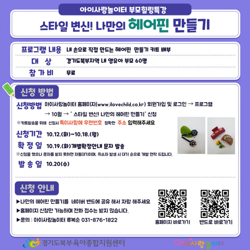 [아이사랑놀이터]"스타일변신 나만의 헤어핀 만들기" 페이지 정보 작성자 관리자 댓글 0건 조회 5,951회 작성일 21-10-08 08:54 목록 본문 문의: 아이사랑놀이터 031-876-1822 이전글[아이사랑놀이터] "산들산들~ 숲에서 놀자" 신청안내 21.10.13 다음글[아이사랑놀이터] 가정양육행사 "박스스토리" 신청안내 21.10.06 댓글 0 댓글목록 등록된 댓글이 없습니다.