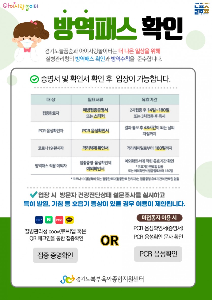 [아이사랑놀이터]방역패스 운영 안내 페이지 정보 작성자 관리자 댓글 0건 조회 6,981회 작성일 21-12-31 14:25 목록 본문 자세한 사항은 첨부파일을 확인해주세요. 이전글[아이사랑놀이터] 경기도 시각장애인 복지관 바자회 안내 22.02.14 다음글[아이사랑놀이터]새해팝업 21.12.31 댓글 0 댓글목록 등록된 댓글이 없습니다.