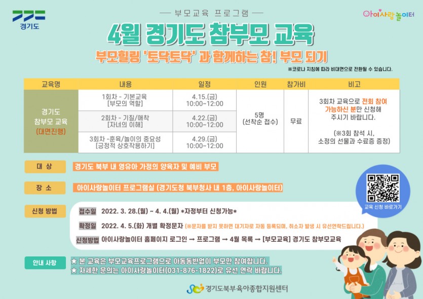 [아이사랑놀이터] 4월 경기도 참부모교육 신청 안내 페이지 정보 작성자 관리자 댓글 0건 조회 5,212회 작성일 22-03-22 15:31 목록 본문 자세한 사항은 첨부파일을 확인해주세요감사합니다.문의 031-876-1822 이전글[아이사랑놀이터] 조물조물 요리키트배부 22.03.24 다음글[아이사랑놀이터] "아빠랑 몸으로 놀자 1기" 마감안내 22.03.22 댓글 0 댓글목록 등록된 댓글이 없습니다.