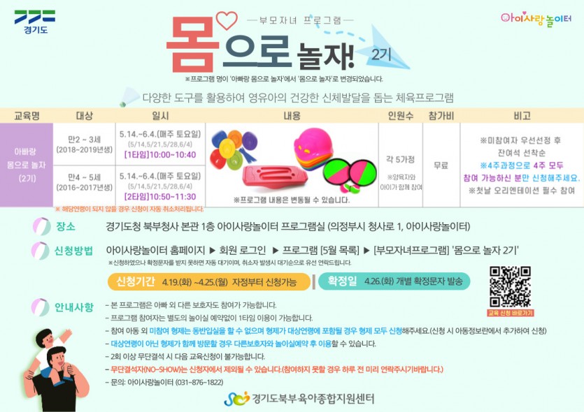 [아이사랑놀이터] 몸으로 놀자 2기 신청안내 페이지 정보 작성자 관리자 댓글 0건 조회 5,113회 작성일 22-04-13 13:17 목록 본문 자세한 내용은 첨부된 파일을 참고해주세요.※전화문의(화~토): 아이사랑놀이터 031-876-1822※카카오채널 문의(월~토): http://pf.kakao.com/_WKmxjxb 이전글[아이사랑놀이터] 흙으로 놀자 2기 마감안내 22.04.14 다음글[아이사랑놀이터]4.23.(토) 임시휴관안내 22.04.13 댓글 0 댓글목록 등록된 댓글이 없습니다.