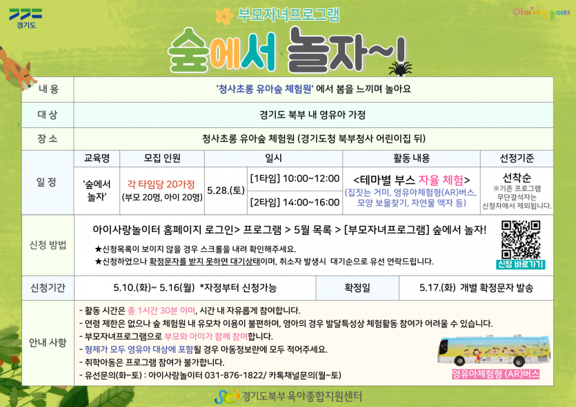 [아이사랑놀이터] 숲에서 놀자! 신청안내 페이지 정보 작성자 관리자 댓글 0건 조회 5,056회 작성일 22-05-03 08:42 목록 본문 자세한 내용은 첨부된 파일을 참고해주세요.※전화문의(화~토): 아이사랑놀이터 031-876-1822※카카오채널 문의(월~토): http://pf.kakao.com/_WKmxjxb 이전글[아이사랑놀이터] 익스플로러 종료로 인한 사이트 전면개편 안내 22.05.04 다음글[아이사랑놀이터] 가정의 달 인형극 모집마감 안내 22.04.19 댓글 0 댓글목록 등록된 댓글이 없습니다.