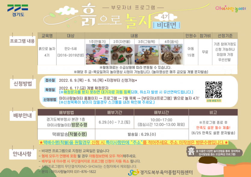 [아이사랑놀이터] 흙으로 놀자 4기 신청안내 페이지 정보 작성자 관리자 댓글 0건 조회 4,774회 작성일 22-06-07 13:30 목록 본문 자세한 내용은 첨부된 파일을 참고해주세요.문의: 아이사랑놀이터 031-876-1822 이전글[아이사랑놀이터] 몸으로 놀자 4기 신청안내 22.06.08 다음글[아이사랑놀이터] 6월 스마트하게 놀자 모집 마감 22.05.30 댓글 0 댓글목록 등록된 댓글이 없습니다.