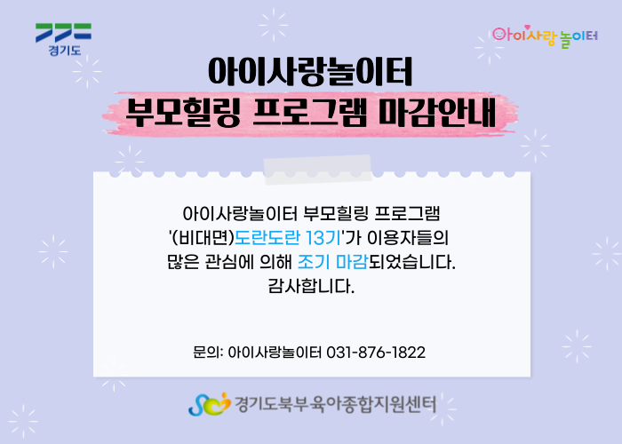 [아이사랑놀이터] 부모힐링 도란도란 13기 마감안내 페이지 정보 작성자 관리자 댓글 0건 조회 4,921회 작성일 22-08-26 10:45 목록 본문 이전글[아이사랑놀이터] 9월 추석 휴관 안내 22.08.29 다음글[아이사랑놀이터] 숲에서 놀자 신청안내 22.08.25 댓글 0 댓글목록 등록된 댓글이 없습니다.