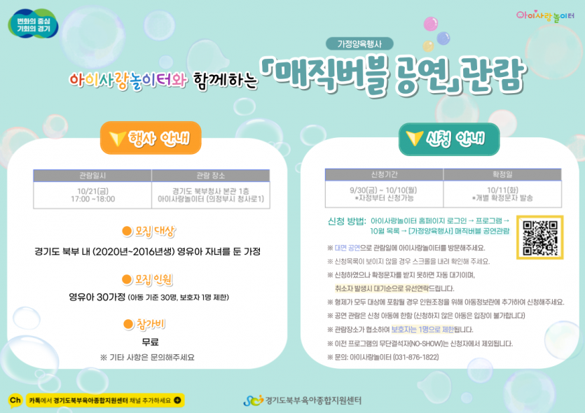 [아이사랑놀이터] 가정양육행사 '매직버블 공연관람' 신청안내 페이지 정보 작성자 관리자 댓글 0건 조회 4,889회 작성일 22-09-28 14:47 목록 본문 자세한 내용은 첨부파일을 참고해주세요.문의: 아이사랑놀이터 031-876-1822 이전글[아이사랑놀이터] 한글날 대체공휴일 휴관 안내 22.10.06 다음글[아이사랑놀이터] 10월 스마트하게 놀자 신청안내 22.09.22 댓글 0 댓글목록 등록된 댓글이 없습니다.