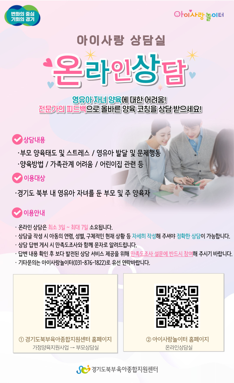 [아이사랑놀이터] 온라인 상담 이용안내 페이지 정보 작성자 관리자 댓글 0건 조회 4,881회 작성일 22-10-27 17:03 목록 본문 ▷자세한 사항은 첨부파일을 이용해 주세요문의:031-876-1822 이전글[놀이터 긴급휴관안내] 11.01~11.09 22.11.07 다음글[아이사랑놀이터] 11월 스마트하게놀자 신청안내 22.10.20 댓글 0 댓글목록 등록된 댓글이 없습니다.