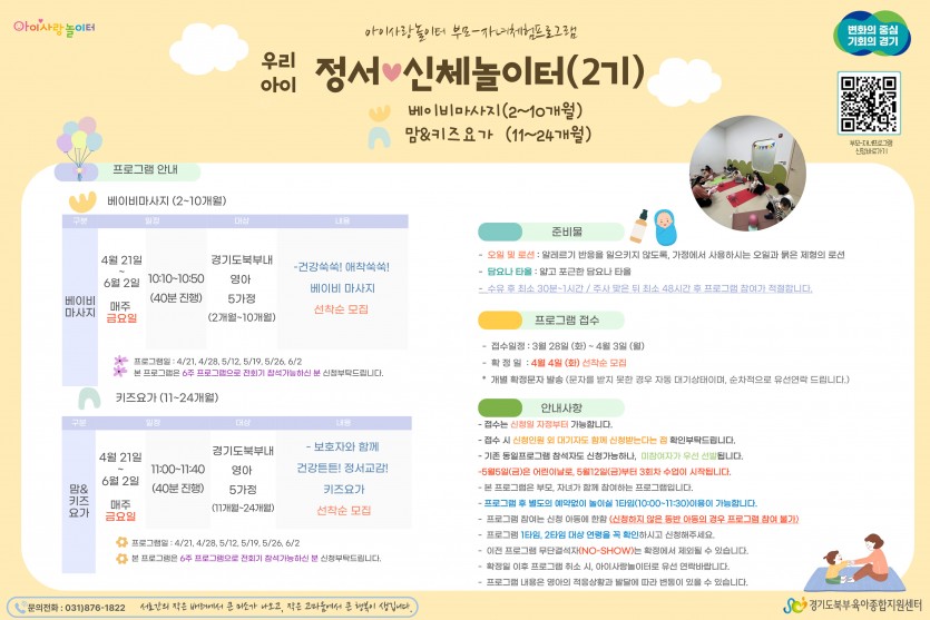 [아이사랑놀이터]베이비마사지/맘&키즈요가 모집안내 페이지 정보 작성자 관리자 댓글 0건 조회 4,845회 작성일 23-03-24 16:07 목록 본문 자세한 내용은 첨부파일을 참고해주세요♡ 문의 : 아이사랑놀이터 031-876-1822 이전글[아이사랑상담실] 종합발달평가 신청안내 23.04.04 다음글[부모교육]4월 부모교육 신청안내 23.03.21 댓글 0 댓글목록 등록된 댓글이 없습니다.